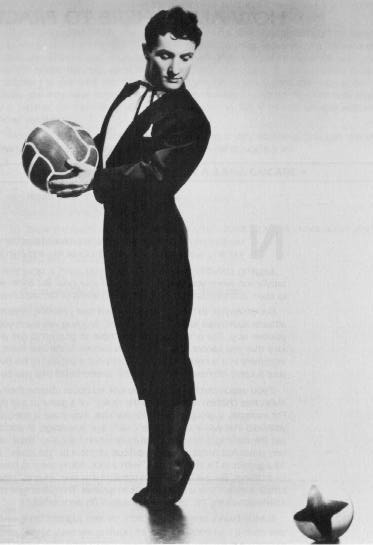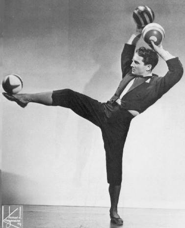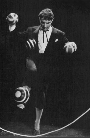 Trying to describe Brunn's act is like trying to describe the flight of a swallow. He juggled three sticks very briefly for an opening with incredible speed. The last stick was thrown high, and not wanting to wait for it to descend, he leaped and snatched it from the air. He followed with inflated ball bouncing on head. But they were not the calculated, rhythmic bounces of the less imaginative juggler. He exerted so much control, that he could bounce the ball erratically, at an angle, and sometimes leaping to strike it with his head at the most unexpected off-beat moment.