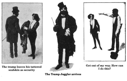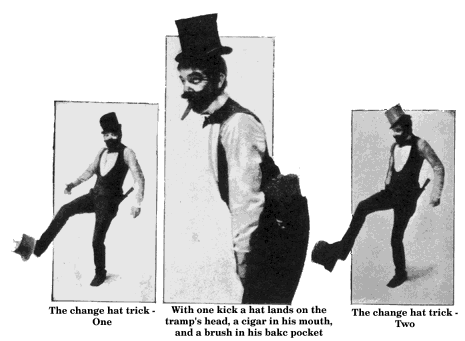 Hat tricksAnother very good trick is with two tall hats, a black and a white, both more or less dilapidated. One the juggler places on his head and the other on his outstretched foot. Simultaneously he jerks the latter up onto his head, and drops the former on to his foot. Like all good tricks, it looks very simple, and isn't. Then he turns his attention to a hat, a cigar and a whisk brush. For this he utilises a large pocket at the back of his trousers, just below the waist. He tosses the articles about in a similar manner to the tennis balls, and finally gets the hat on to his head, the cigar into his mouth, and the brush into his back pocket.