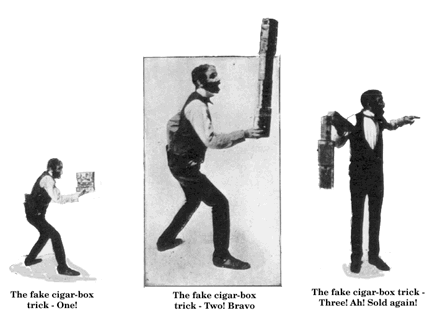 Fake cigar-box trickOne of the tricks which Mr. Fields performs is not clever, but is certainly very funny. And thereby hangs a tale. The description first, then the tale. The juggler produces from his table a few cigar boxes, reposing one on top of the other in the orthodox manner. He makes a great show of preparing for a coup, something to startle you; and does, in fact, perform what you believe to be a really remarkable feat of manipulation. Anyway, you applaud vigorously, and are sorry for it afterwards. I freely admit I did applaud and was sorry; annoyed, almost savage. I was within an ace of blushing, a thing I have not known myself to do for many years.