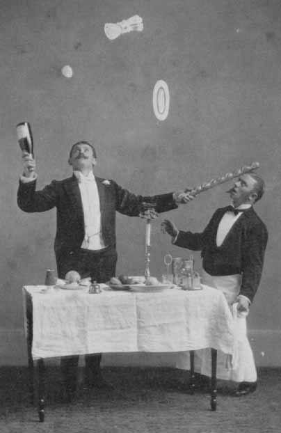 His finish trick was balancing a plate on his forehead, spinning another on a pole in his left hand and juggling two plates in his right. He let the plate fall from his forehead and juggled 3 plates with his right hand. He brought the effect to a climax by continuing until the curtain fell. It shortly opened again to reveal him still juggling as before.