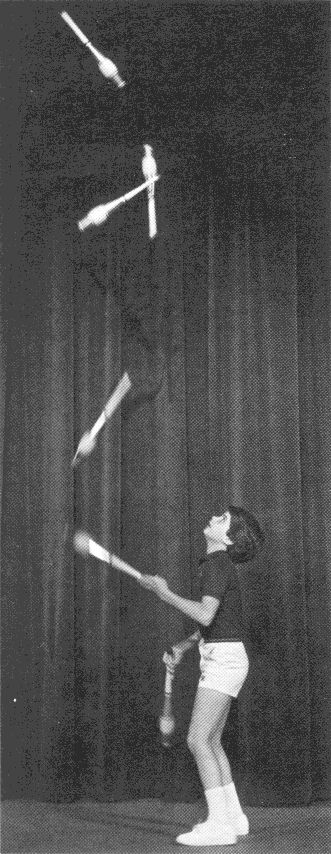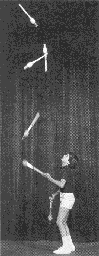 His eight ball juggling is coming along nicely, and he flashes nine rings in his act if the height of the ceiling allows it. He does a full pirouette with seven rings and balls, and can balance a ball on his head while juggling seven more. He now has a little more strength to power his Herculean juggling feats. He has grown to five feet tall and now weighs 100 pounds! Is he getting too old to juggle? We'll find out soon, as Anthony becomes a teenage on April 14. He will juggle in Las Vegas at the Hilton Hotels until July, then return to the Trump Palace in Atlantic City.